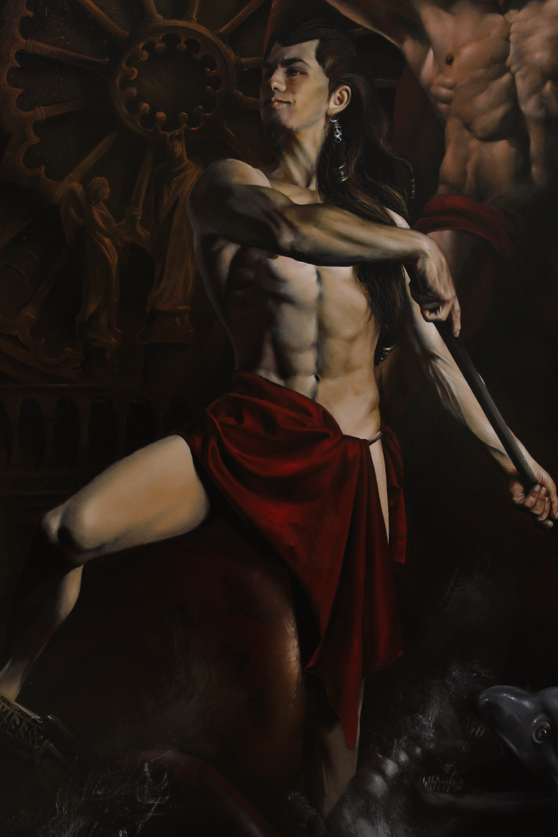 In secondo piano troviamo sempre Loki Trionfante, con le braccia aperte in un gesto ampio e potente, come se da un momento all’altro scendesse in picchiata a consumare spietato la sua vendetta. La posa raffigurata è una mera citazione del dipinto di Mihály Zichy, “The Triumph of the Genius of Destruction”, datato 1878.