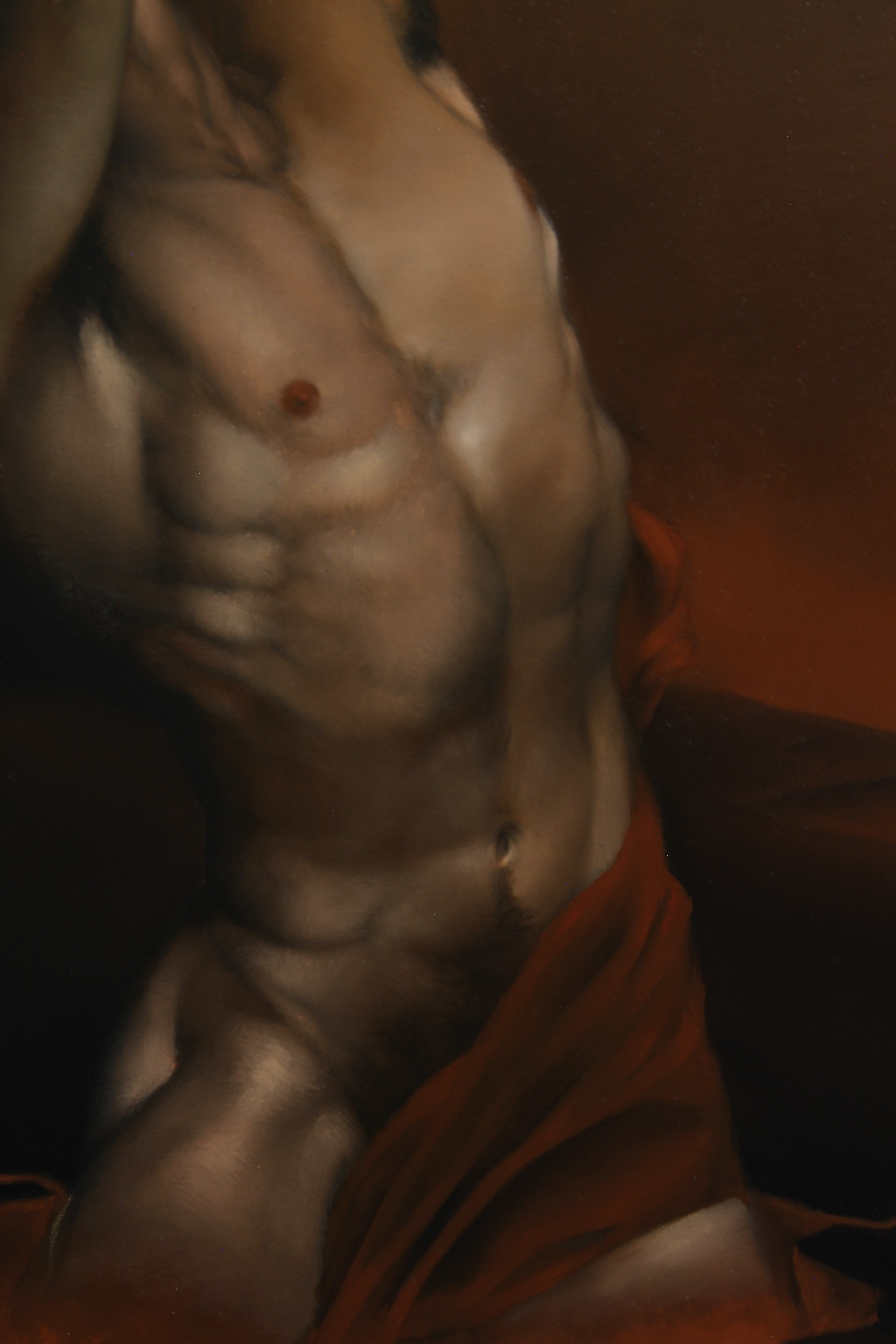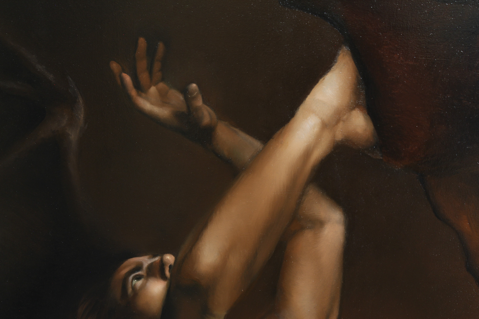 e cadde rotolando nel golfo di fuoco, travolto, sebbene