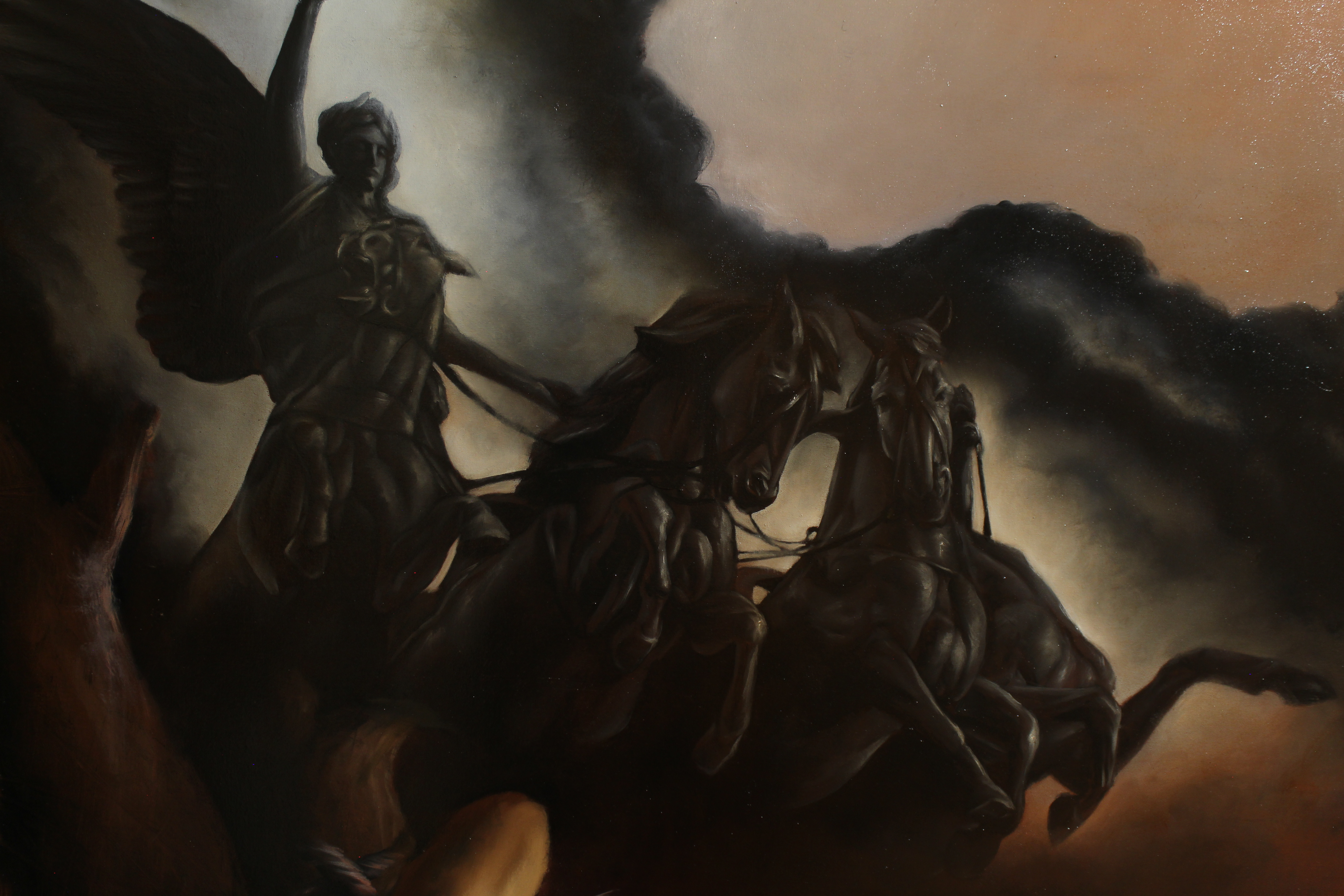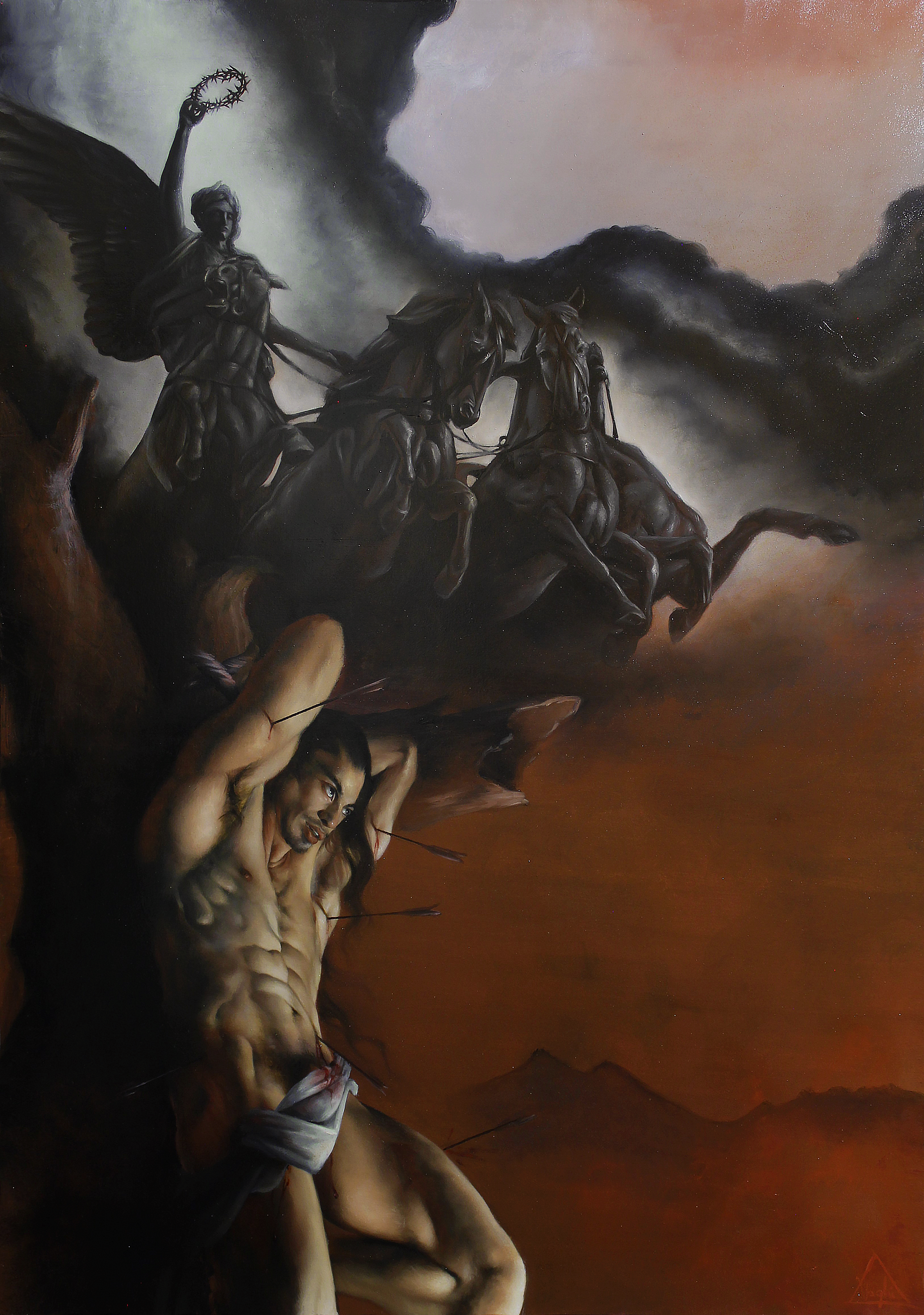 Sullo sfondo non si intravede Roma, ma un tipico paesaggio delle Prealpi lombarde, in riferimento al luogo di abitazione dell’artista. In alto, all’insorgere di una tempesta, ecco arrivare scalpitanti quattro cavalli neri, guidati da una Vittoria Alata la quale sorregge trionfante non una corona di alloro – come vuole la tradizione pagana – ma una corona di spine.