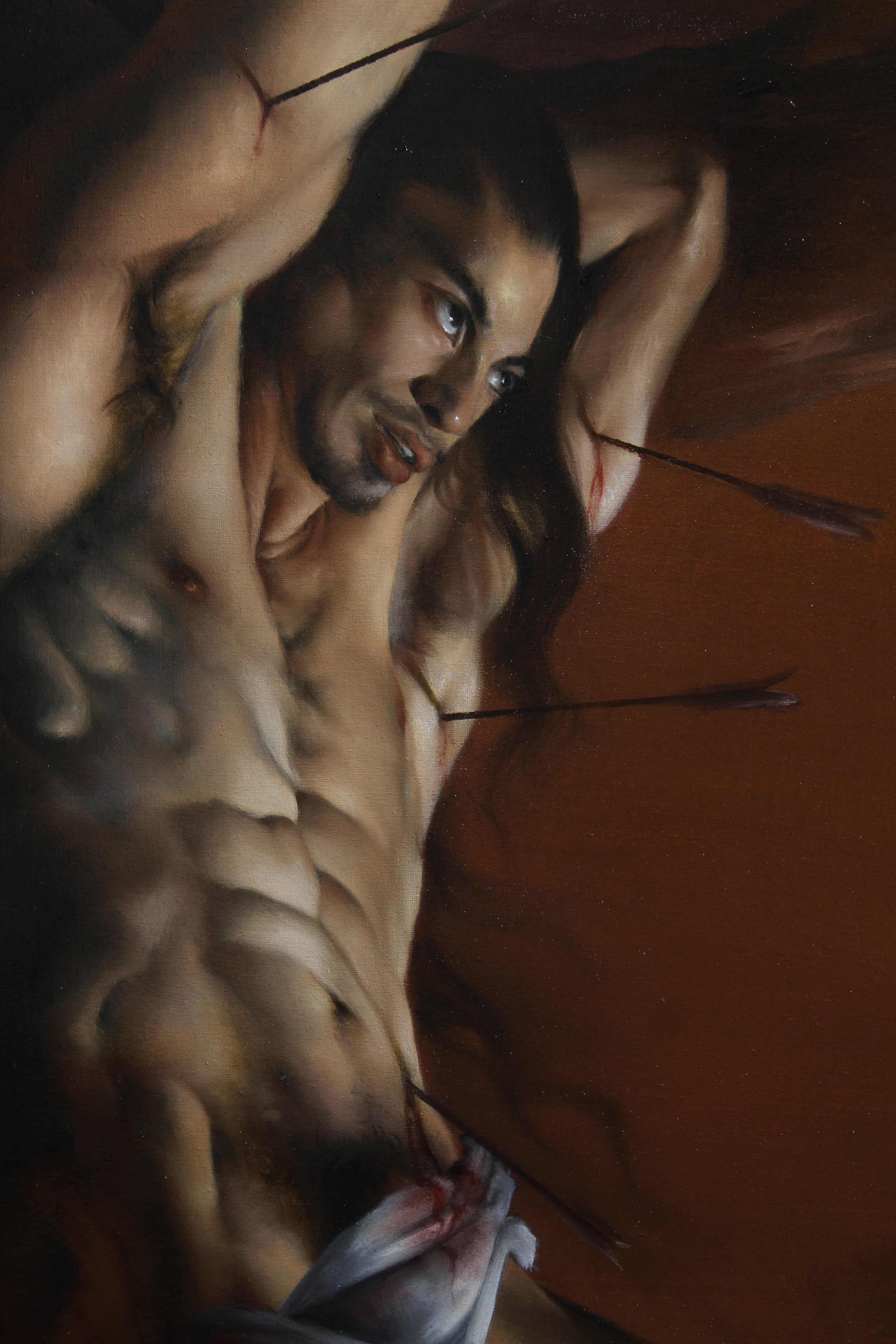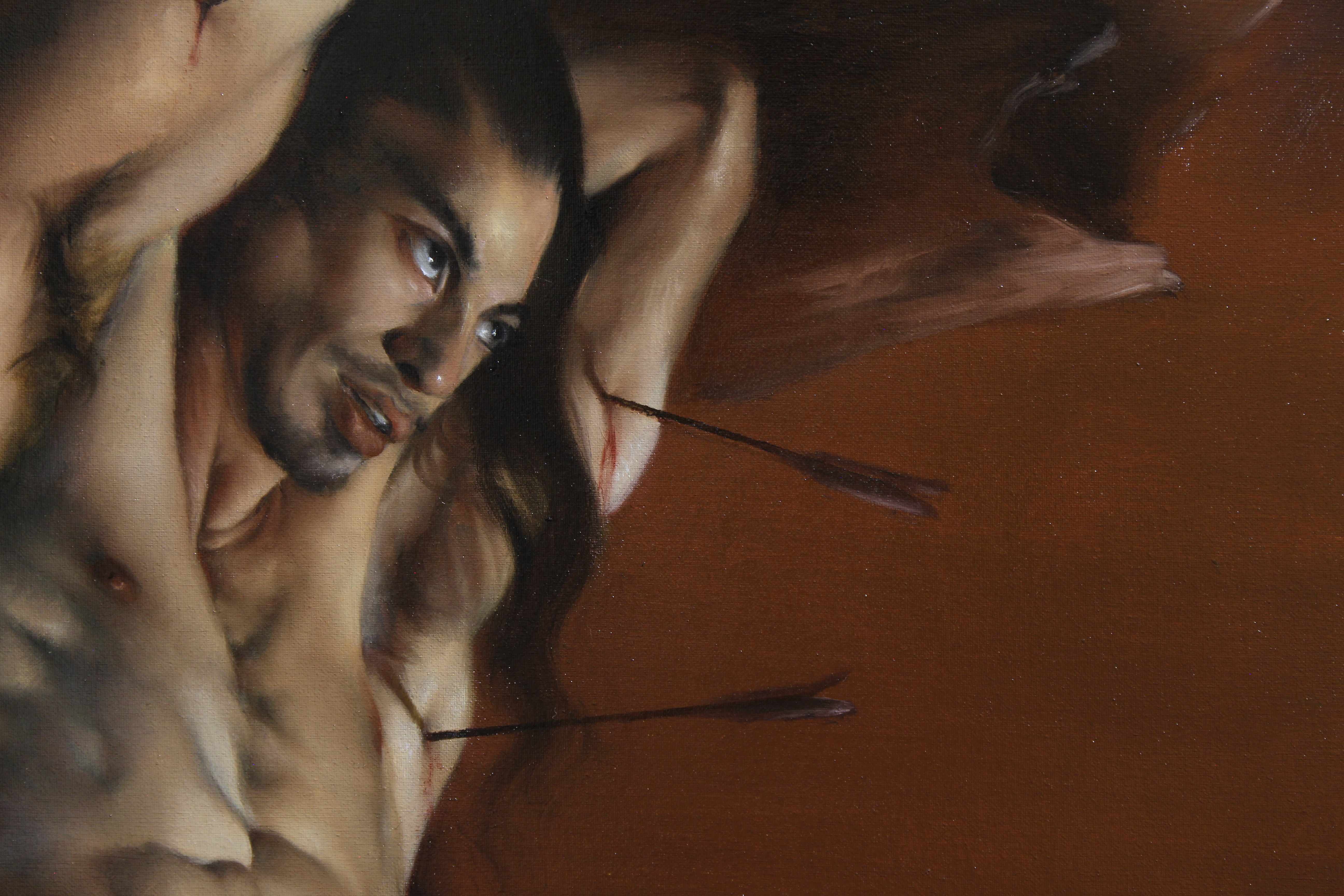 La tortura fisica inflitta dalle frecce è temperata dalla luce della Fede che San Sebastiano sprigiona nel proprio animo; il sangue della passione scivola quieto sulla pelle del Santo come “ombre d’un ramo che cadono su una scala di marmo” (Yukio Mishima).