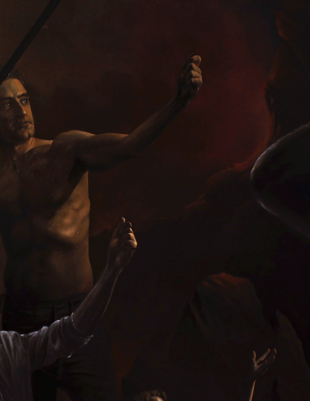 Diversamente da quanto raccontano i miti, il Pan in questione non viene raffigurato come un essere dall’aspetto orribile ma, anzi, presenta un corpo muscoloso, forte, pulito e un viso dai lineamenti piuttosto armonici nonostante il supplizio. Al contrario, i sacerdoti, che nella vita cristiana dovrebbero rappresentare il Bene Assoluto, appaiono all’improvviso dalle fiamme, con quegli sguardi così terrificanti e demoniaci, quasi come se fossero loro i veri “mostri”.